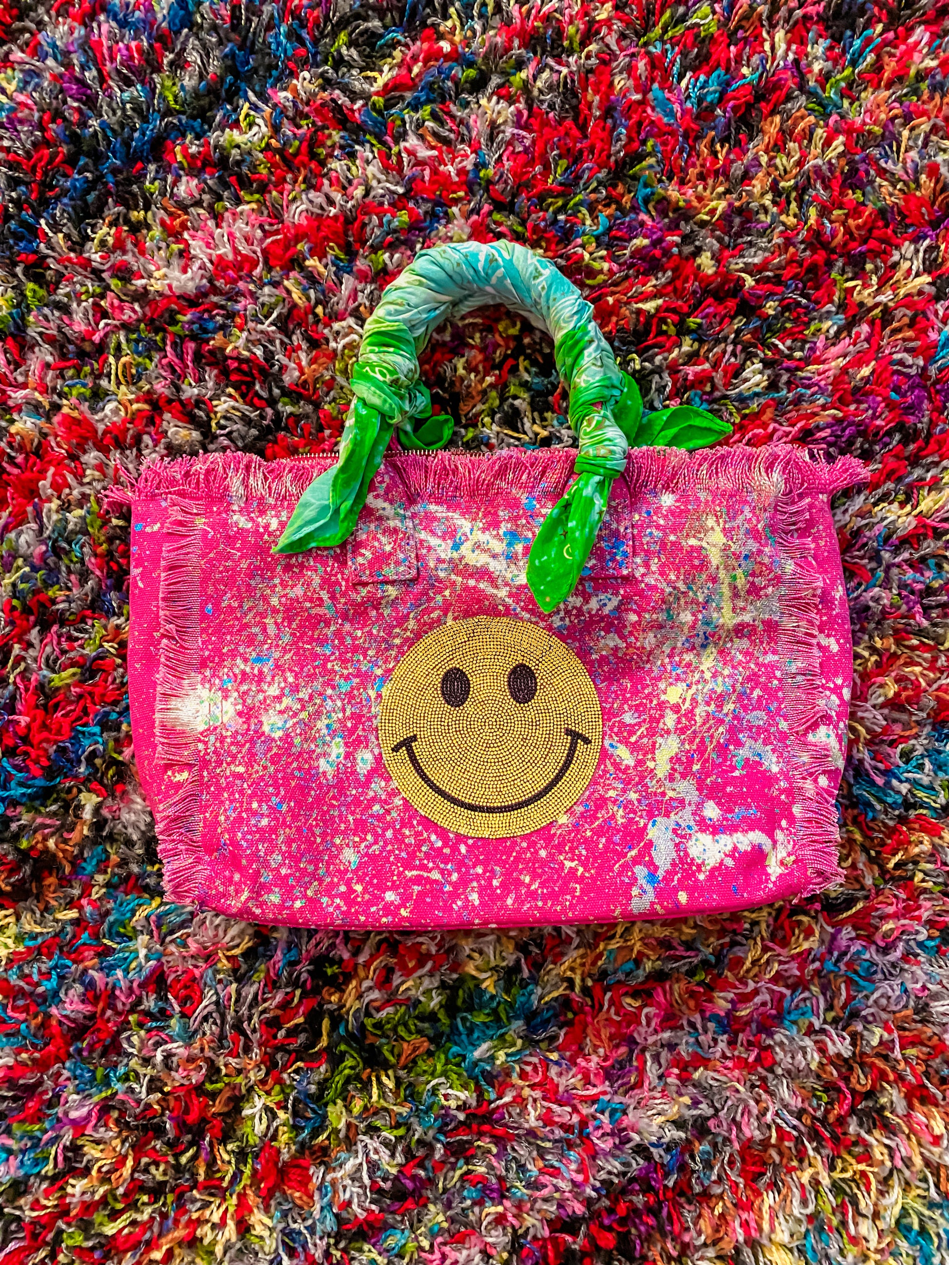 A playful yet practical accessory designed to brighten up your day. This tote combines bold color, sparkling details, and fun fringe to create a standout piece perfect for any occasion.