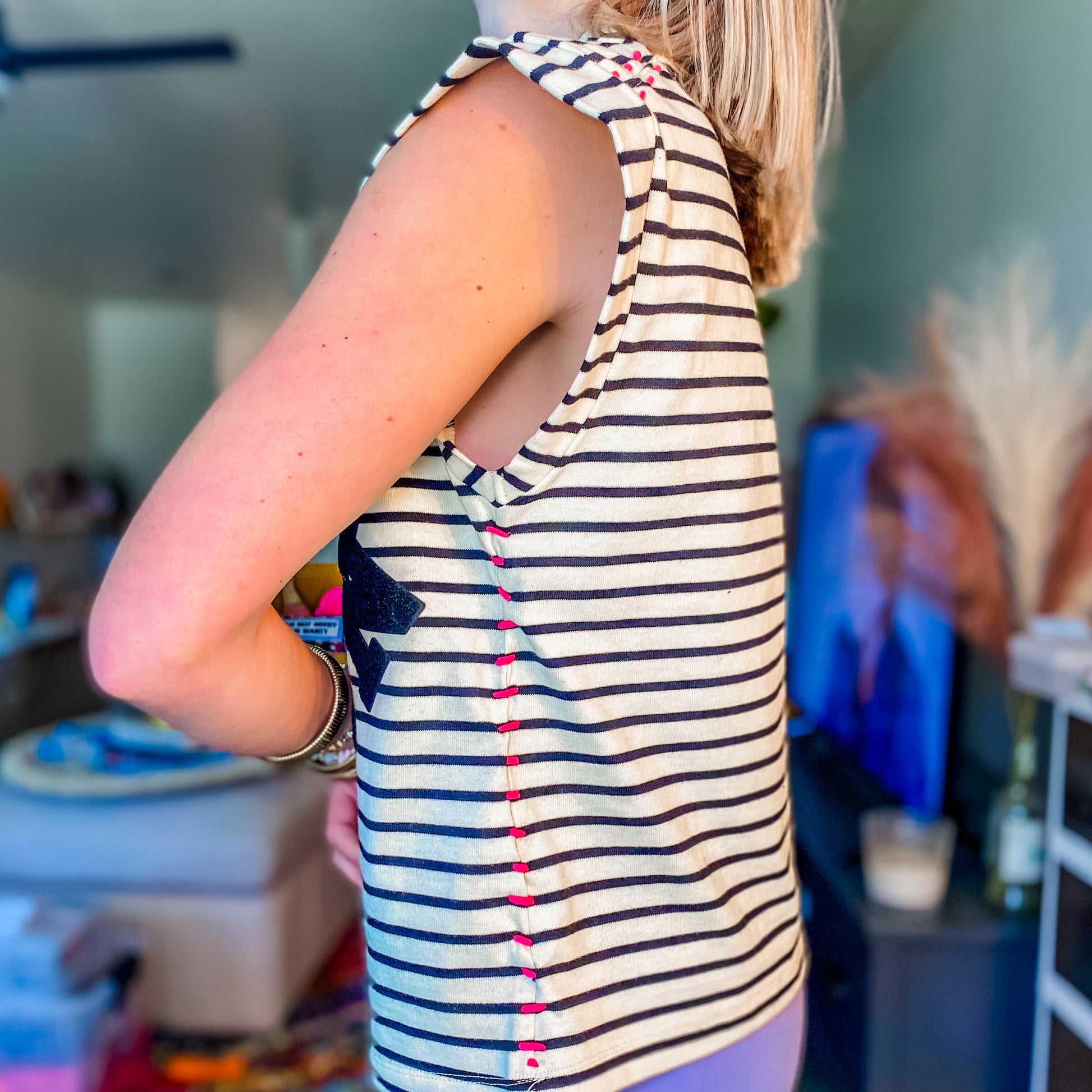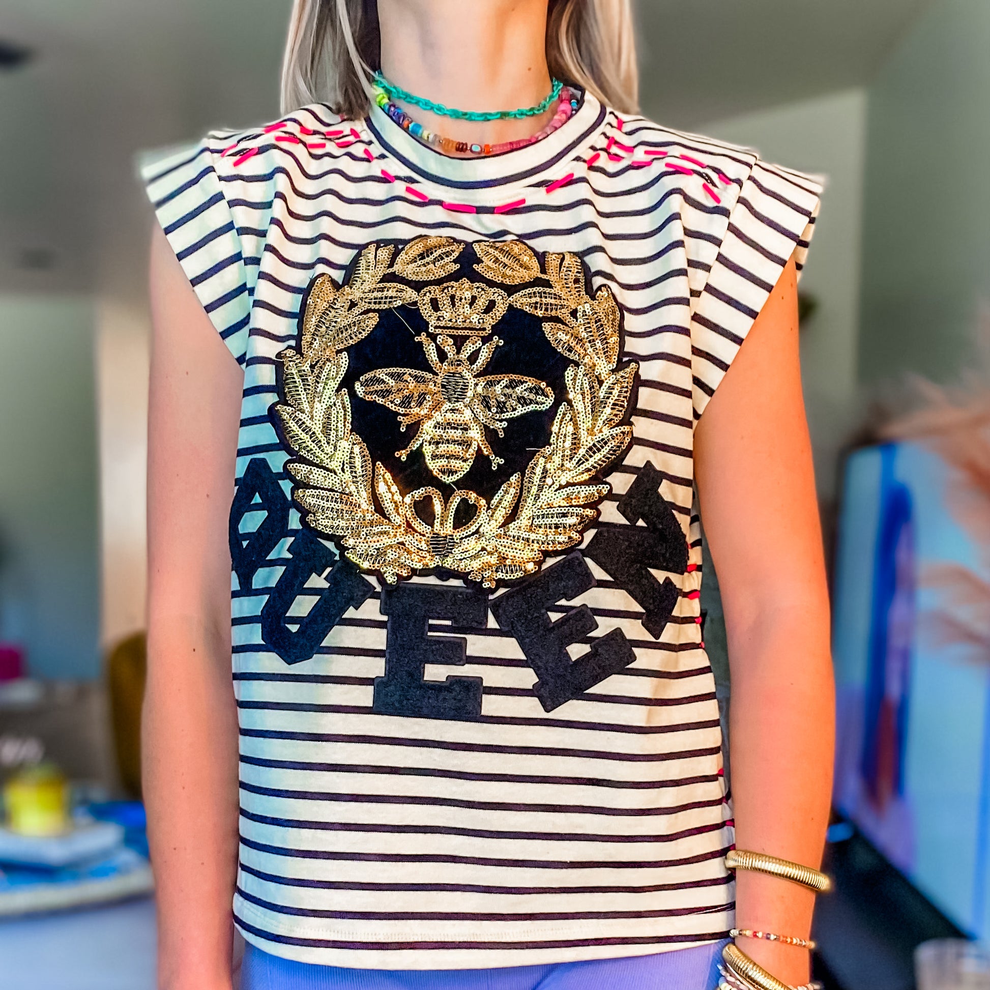 This top features a bold and stylish design perfect for making a statement. The striped fabric provides a classic yet trendy base, while the standout feature is the intricately embroidered golden bee emblem. Below the emblem, the word “QUEEN” is prominently displayed, making it suitable for both dressing up or dressing down.