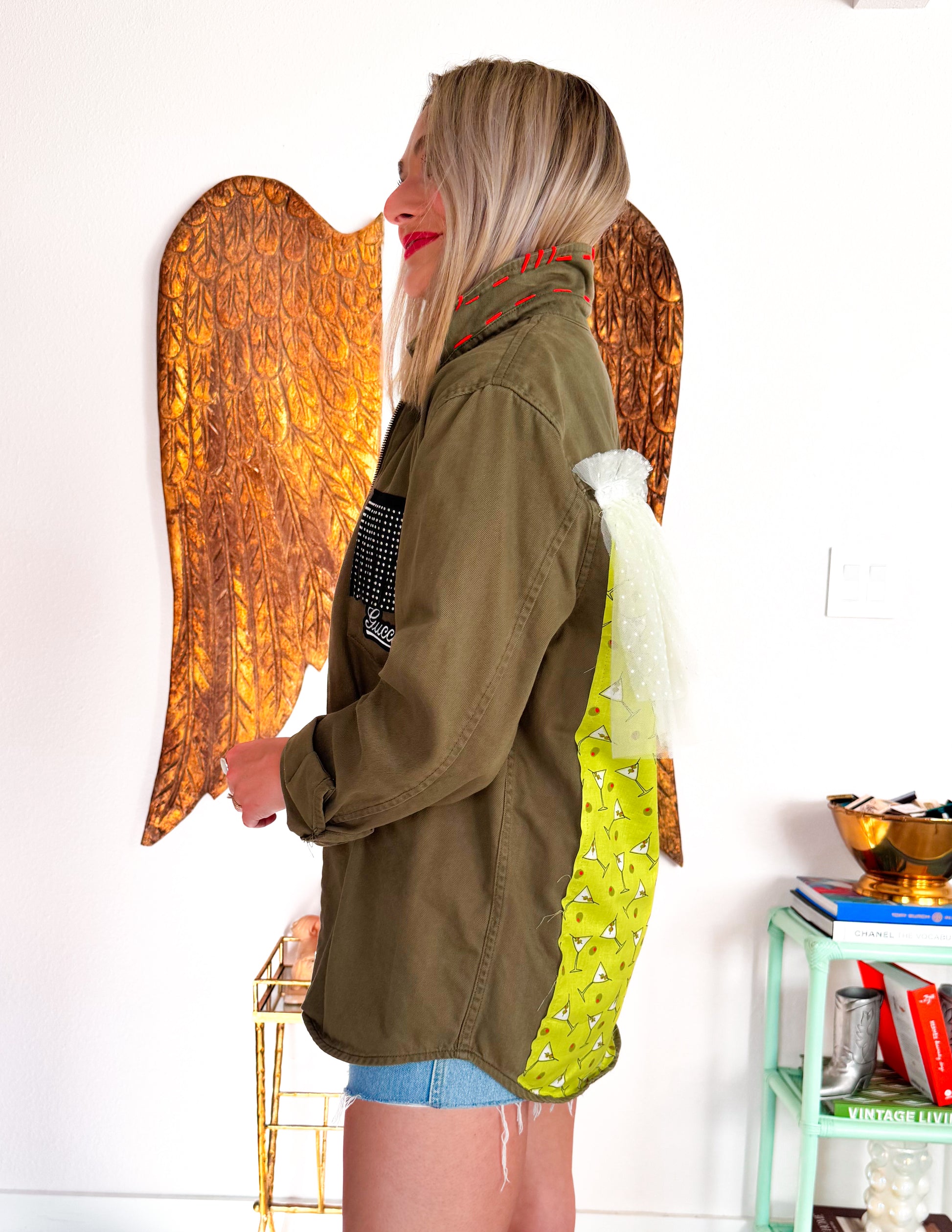 This olive green utility jacket gets a flirty twist with a black studded fringe pocket, cherry red stitching, dotted tulle ruffle, and a bold martini glass print back in electric lime.
